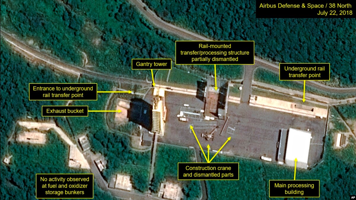 Citra satelit menunjukkan pembongkaran bangunan pemrosesan yang dipasangi rel, di mana kendaraan peluncur antariksa dirakit sebelum dipindahkan ke landasan peluncuran, serta tempat uji mesin di dekatnya di mana mesin-mesin berbahan bakar cair dikembangkan untuk rudal balistik dan kendaraan peluncur antariksa, sebut 38 North.
