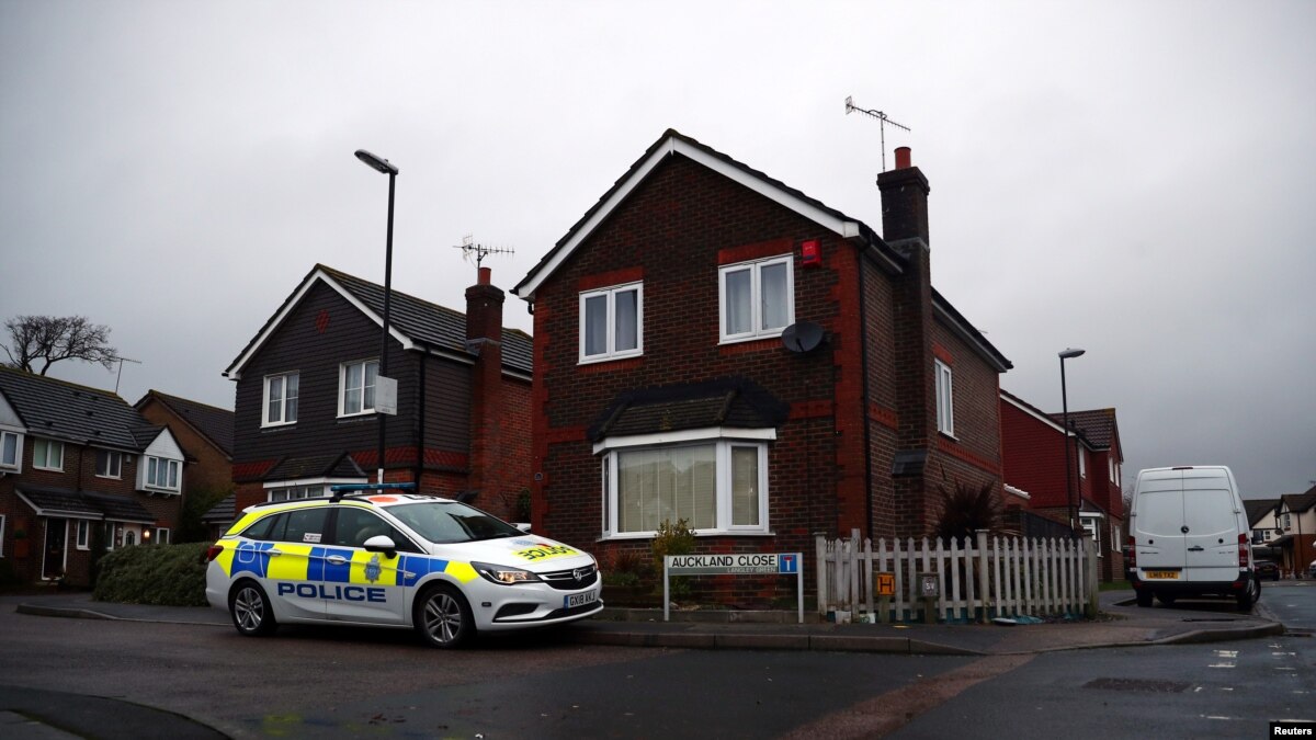 Polisi Inggris menggeledah kendaraan di luar sebuah properti di Crawley hari Sabtu.