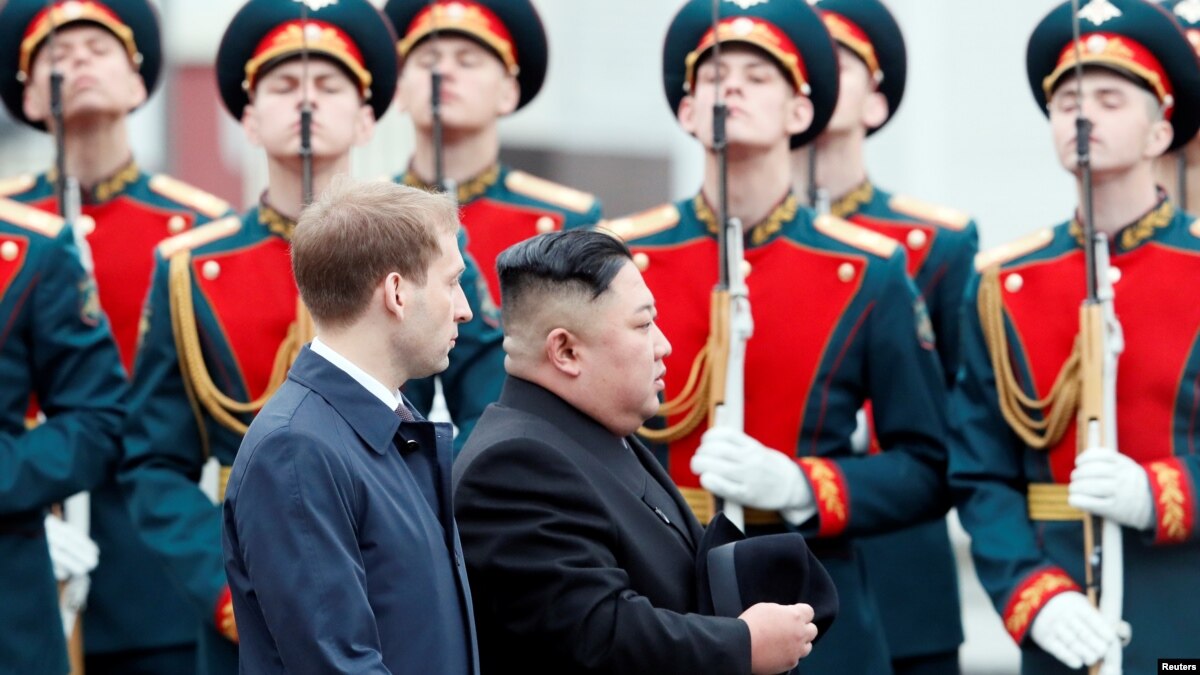 Mengenakan topi hitam dan baju dingin berwarna gelap, Kim Jong-un sambil tersenyum disambut oleh para petinggi Rusia dan barisan musik militer di kota pelabuhan Vladivostok. Ia melakukan perjalanan yang pendek ke Vladivostok dengan kereta api lapis baja khusus yang berwarna hijau dan kuning.